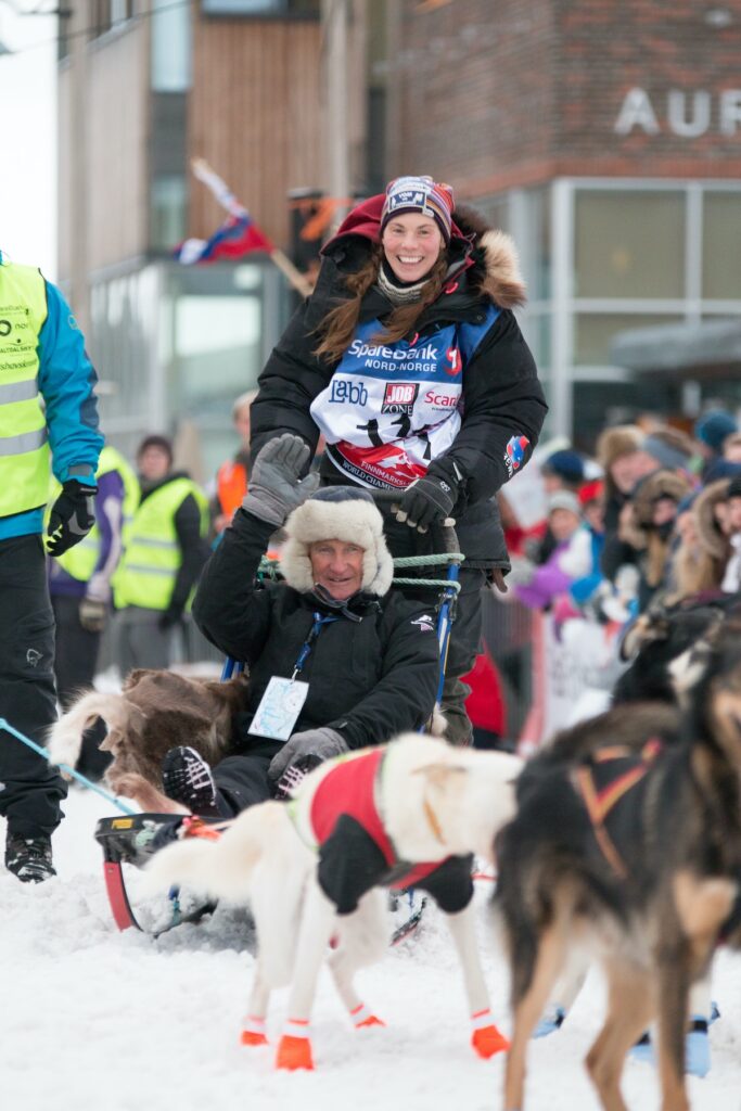 TWO WORLD CHAMPIONS: Double world champions. Bjørn Wirkola has two World Championship golds in ski jumping, Sigrid Ekran has two World Championship titles in long-distance sled dog racing. During the World Championship in 2015, it was of course Ekran who got the honor of having Wirkola in the sled from the start to restart in Sorrisniva. Photo: Geir Stian Altmann Larsen.